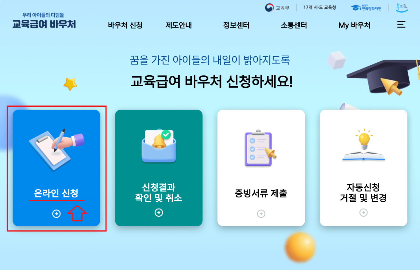 참고: 2024년도에 신용·체크카드로 교육급여 바우처를 수혜한 대상은 2025년도 지원자격 유지 시, 별도의 신청 없이 기존에 지원받았던 카드로 바우처 포인트가 자동으로 배정됩니다.
