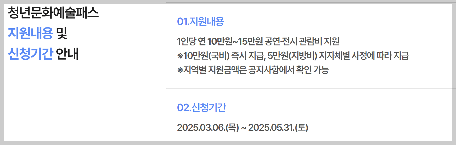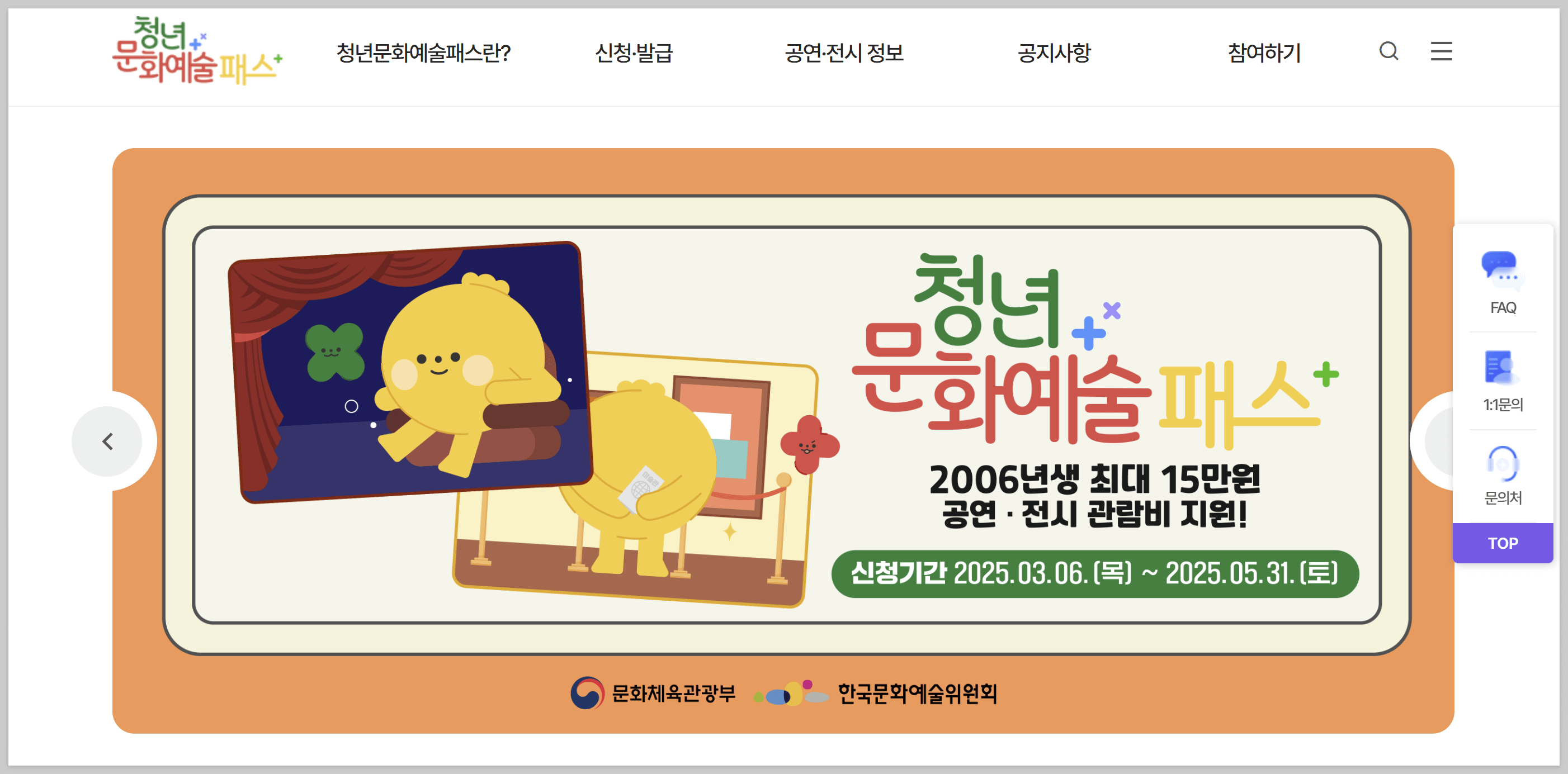 2025년에는 2006년생이 이 혜택을 받을 수 있으며, 특히 2024년 11월부터 대중음악 콘서트와 팬미팅에서도 사용 가능해졌습니다. 이번 글에서는 청년문화예술패스의 신청방법과 사용처, 그리고 콘서트 및 팬미팅에서의 활용 가능성까지 자세히 안내해드리겠습니다. 단, 선착순으로 지원받을 수 있기에 빠른 신청이 필요합니다.