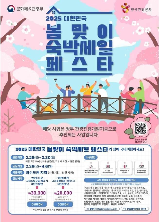 따뜻한 봄이 다가오면서 여행을 계획하시는 분들을 위해 반가운 소식이 있습니다. 문화체육관광부와 한국관광공사가 주관하는 '2025 대한민국 봄맞이 숙박세일 페스타'가 2월 28일부터 시작됩니다. 이번 행사는 비수도권 지역의 숙박 할인 혜택을 통해 국내 관광을 활성화하고자 마련되었습니다. 여행을 계획 중이시라면 이번 기회를 통해 알찬 혜택을 누려보시기 바랍니다.